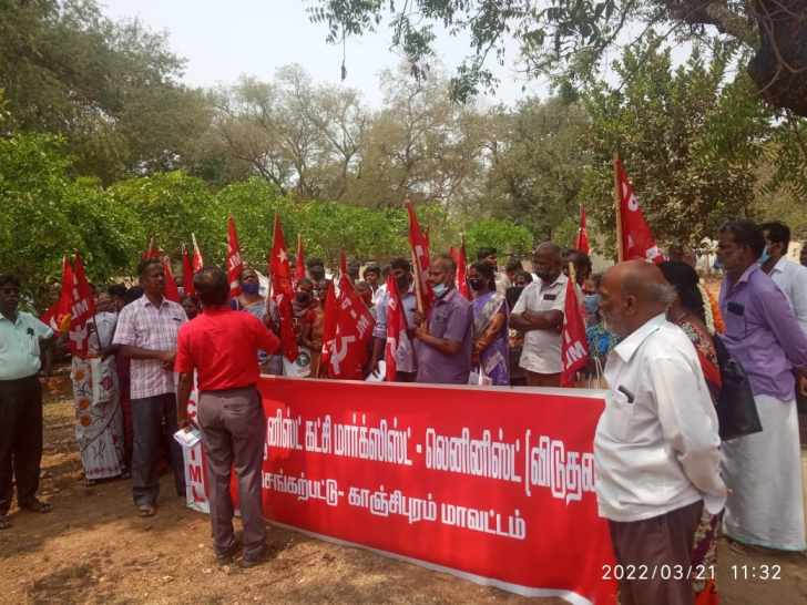 செங்கற்பட்டு மாவட்டத்தில் வல்லாஞ் சேரி, பொத்தேரி மக்களின் குடியிருப்புகளை 21 நாட்களில் அகற்றப்போவதாக 10.03.2022 அன்று 211 குடியிருப்புகளுக்கு நீர்வள ஆதாரத் துறையினர் அறிவிப்பு கொடுத்துள்ளனர். குடியிருப்புகளை அப்புறப்படுத்தக்கூடாது என்று 21.03.2022 அன்று செங்கற்பட்டு மாவட்ட ஆட்சியர் அலுவலகத்தை குடியிருப்பாளர் களுடன் குறைதீர் கூட்டத்தில் முற்றுகையிட்டு மாவட்ட ஆட்சியரிடம் இந்திய கம்யூனிஸ்ட் கட்சி (மார்க்சிஸ்ட் - லெனினிஸ்ட்) கிளை செயலாளர் ஹமீத் தலைமையில் மாவட்ட செயலாளர் சொ.இரணியப்பன் மனு கொடுத்தார். மாவட்ட ஆட்சியர் மனுவைப் பெற்றுக்கொண்டு குடியிருப்பு பகுதியை நேரில் பார்வையிடுவதாக உறுதியளித்தார். குடியிருப்பு மக்கள் மாவட்ட ஆட்சியரின் வருகையை எதிர் நோக்கியுள்ளனர். இதே பகுதியில் உள்ள SRM பல்கலைகழகத்தின் ஆக்கிரமிப்புகள் மீது அரசும், நீதிமன்றமும் நடவடிக்கை எடுக்கவில்லை.