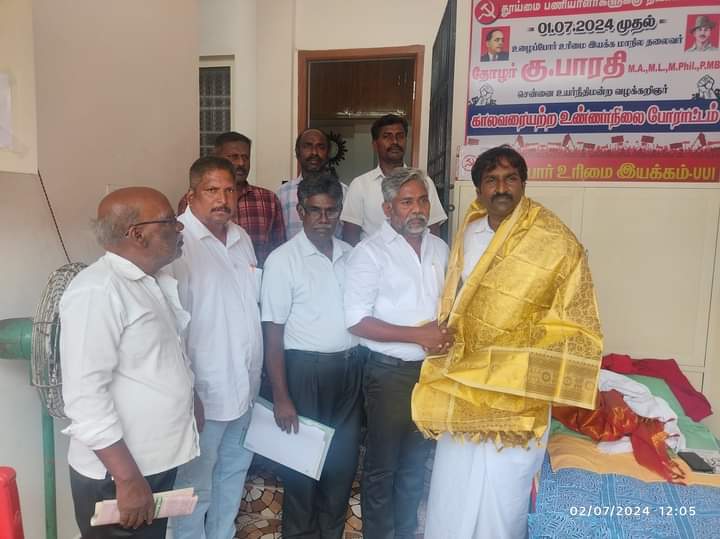 தமிழ்நாட்டில் சென்னை முதல் கோவை, சேலம், தூத்துக்குடி, நெல்லை ,தென்காசி வரை தூய்மைப் பணியாளர் நாள்தோறும் போராடிக் கொண்டிருக்கிறார்கள். கூலி உயர்வு, பணிநிரந்தரம் கேட்டு போராடிக் கொண்டிருந்த தூய்மைப் பணியாளர்கள் தனியார் மயமாக்கத்திற்கு எதிராகப் போராடிக் கொண்டிருக்கிறார்கள். மாநகராட்சி, நகராட்சி, ஊராட்சி நிர்வாகங்களின் கீழ் பணிபுரிந்து கொண்டிருக்கும் தூய்மைப் பணியாளர்கள் ஒப்பந்ததாரர்களுக்கு கீழ் அல்லது தனியார் நிறுவனங்களுக்குக் கீழ் பணி செய்ய நிர்பந்திக்கப்படுகிறார்கள். சென்னை மாநகராட்சியின் கீழ் பணி செய்யும் நூற்றுக்கணக்கான தொழிலாளர்கள் உழைப்போர் உரிமை இயக்கத்தின் தலைமையில் பணி நிரந்தரம் கோரியும், தனியார் மயமாக்கத்திற்கு எதிராகவும் போராடி வருகிறார்கள். 19.10.2021 தேதிய தமிழ்நாடு முதலமைச்சர் மு.க.ஸ்டாலின் கடிதப்படி, பல ஆண்டுகளாகப் பணிபுரிந்து வரும் சென்னை மாநகராட்சி தூய்மைப் பணியாளர்களைப் பணி நிரந்தரம் செய்வதற்குப் பதிலாக, அவர்களை தனியார் நிறுவனத்தின் கீழும் ஒப்பந்ததாரர் கீழும் பணி செய்ய நிர்பந்திப்பதற்கு எதிராக பல மாதங்களாக பல்வேறு கட்ட போராட்டங்களை எல்டியுசியின் தலைமையின் கீழ் நடத்திவருகிறார்கள். தூய்மைப் பணியாளர்களின் கோரிக்கையை நிறைவேற்றக் கோரி எல்டியுசி பொதுச் செயலாளர் தோழர் கு.பாரதி காலவரையற்ற பட்டினிப் போராட்டத்தை நடத்தினார். அப்போது இகக(மாலெ) தமிழ்நாடு மாநிலச் செயலாளர் தோழர் பழ.ஆசைத்தம்பி, ஏஐசிசிடியு மாநில சிறப்புத் தலைவர் தோழர் இரணியப்பன் மற்றும் ஏஐசிசிடியு தலைவர்கள் பட்டினி போராட்டத்துக்கு ஆதரவு தெரிவித்தனர். அப்பட்டினிப் போராட்டத்தின் வாயிலாக கோரிக்கைகளை நிறைவேற்றுவதற்கு சென்னை மாநகராட்சி ஆணையர் உத்தரவாதம் அளித்தார். ஆனால், மிக முக்கிய கோரிக்கையான பணிநிரந்தரம் செய்யப்படுவதற்கு மாறாக, தனியார்மயமாக்குவதற்கான நடவடிக்கைகள் மேற்கொள்ளப்பட்டு வருகின்றன. இதைக் கண்டித்து சென்னை மாநகராட்சி தூய்மைப் பணியாளர்கள் தொடர் போராட்டத்தை நடத்திவருகிறார்கள். பெண்தொழிலாளர் பெரும்பான்மையாக போராட்டத்தில் கலந்து கொண்ட ஆயிரத்துக்கும் மேற்பட்ட தொழிலாளரை கைதுசெய்து மண்டபத்தில் அடைத்து வைத்தது மாநகராட்சி நிர்வாகம். அந்தத் தொழிலாளரை சந்தித்து ஏஐசிசிடியு மாநில சிறப்புத் தலைவர் தோழர் இரணியப்பன் ஆதரவினையும் வாழ்த்துகளையும் தெரிவித்துப் பேசினார்.