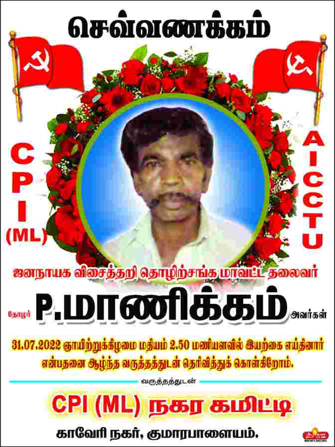 நாமக்கல் மாவட்ட ஏஐசிசிடியு ஜனநாயக விசைத்தறி தொழிலாளர் சங்கத் தலைவர் தோழர் ப.மாணிக்கம் உடல் நலக் குறைவால் 31.7.2022 அன்று காலமானார். அவரது வீட்டிற்குச் சென்று இகக(மாலெ) மத்திய கமிட்டி உறுப்பினர் தோழர் அ.சந்திர மோகன், நாமக்கல் மாவட்டச் செயலாளர் தோழர் பொன்.கதிரவன், ஒன்றிய செயலாளர் தோழர் வெங்கடேசன், நகர செயலாளர் தோழர் சுப்ரமணி மற்றும் தோழர்கள் முருகன், பேபி, இக்க(மாலெ) மற்றும் ஏஐசிசிடியு முன்னணி நிர்வாகிகள், தோழர் மாணிக்கம் உடலுக்கு செங்கொடி போர்த்தி அஞ்சலி செலுத்தினர்.